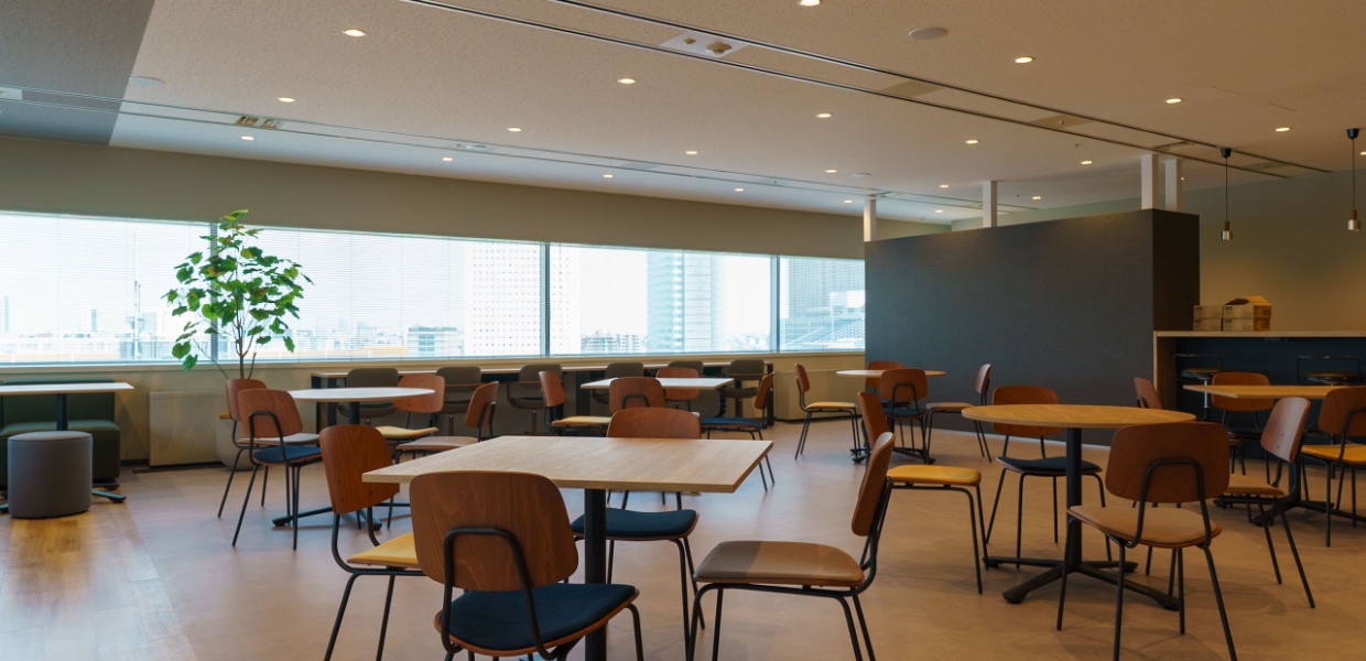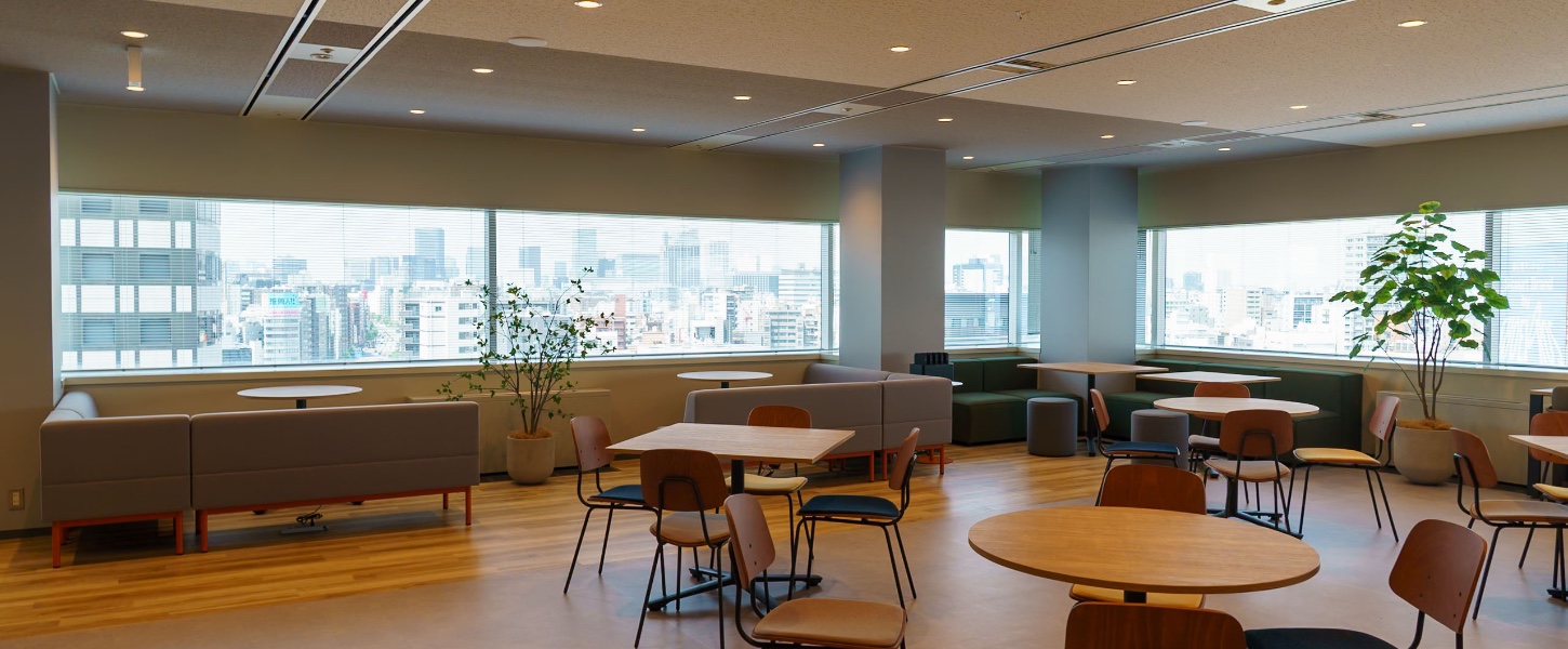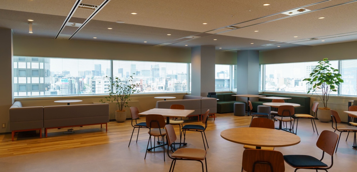 オフィスのシンボルともいえるのが、最上階に設けられたスカイラウンジです。大きな窓から自然光が差し込み、外の景色を一望できる開放的な空間は、リラックスしながら発想を広げる場所としても活用されています。昼は明るく爽やかに、夜は都心の夜景を望める落ち着いた雰囲気に。ランチタイムや社内イベント、社員同士の交流の場としても親しまれています。