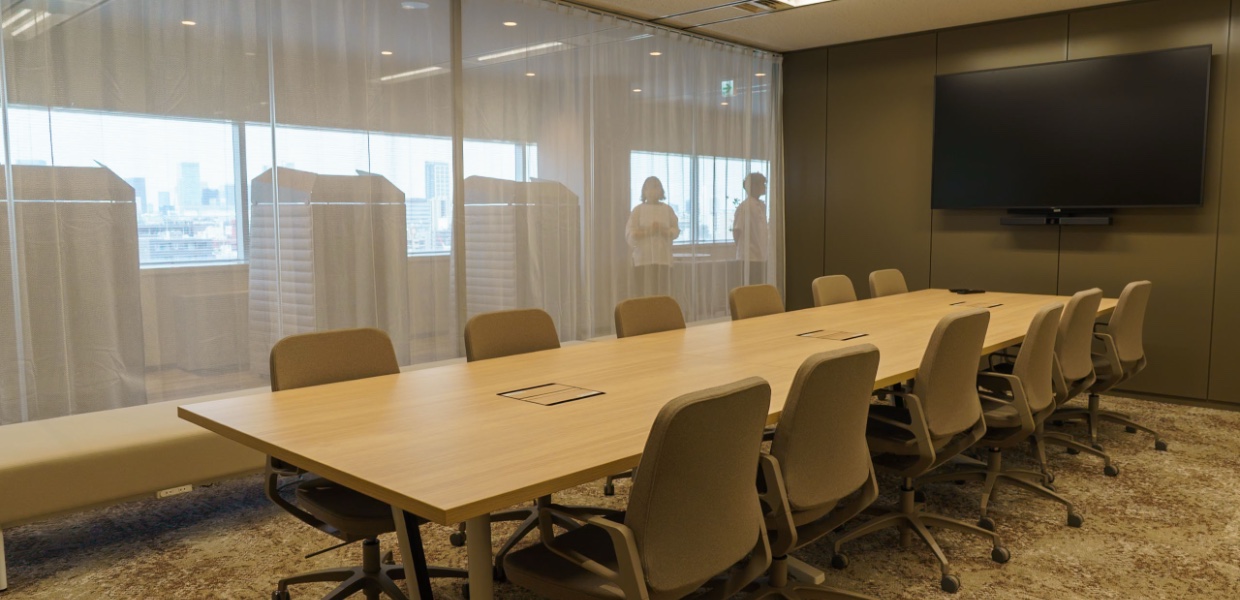 用途や人数に応じて選べる3種類の会議室を設置しています。スモール(Small)は少人数の打ち合わせや面談に最適なコンパクトルーム、ミディアム(Medium)はチームミーティングや社内研修向けの中規模スペース、グランデ(Grande)は大人数の会議やプレゼンテーションに対応する大会議室です。どの会議室も落ち着いたデザインと機能性を備え、コミュニケーションの質を高める空間づくりを意識しています。