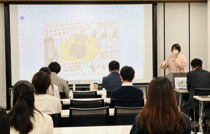 2024年10月1日(火)にオリエンテーションを実施し、11月5日(火)には学生による商品企画案の中間発表会を開催。最終発表は12月24日(火)に行われ、最優秀賞である「UFエジソン ニューエイジ賞」には、博多ゼミに所属する内藤真帆さんの『まんぷくあにまるぽーちキーホルダー』が選出されました。