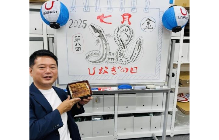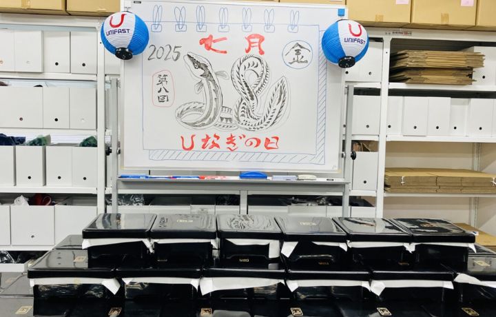 当社は、土用の丑の日の前日である2025年7月18日(金)に、創業1800年、日本橋にある老舗鰻店「大江戸」の特上のうな重をふるまう恒例行事『第8回 U(ウ)なぎの日』(UNIFASTうなぎの日)を開催しました。この行事を通じて、暑気払いや社員への労いを図り、”おいしい”を通じて社内コミュニケーションや社員のエンゲージメントを促進しました。